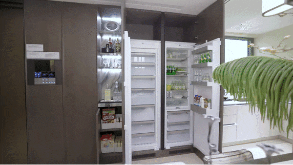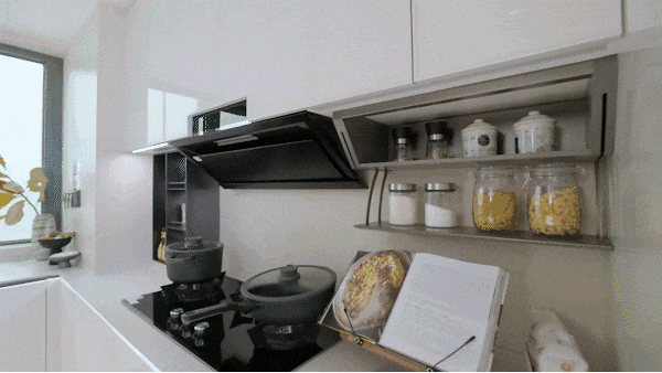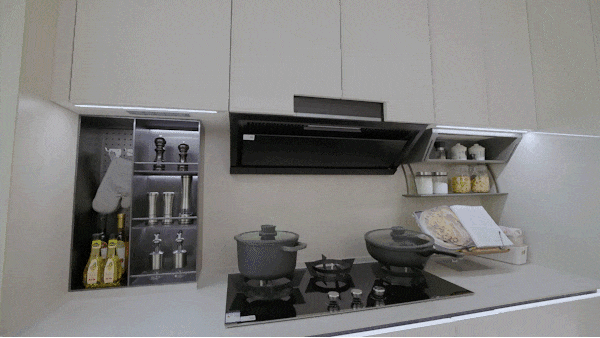 共同抽拉置物架、地柜联动拉篮、下拉拉篮、三沉骑马柜、随心抽、窄柜高深拉篮的组合拳,当你双手提着沉沉的物品或是忙碌了一天筋疲力尽时,工做单元,胜过万万句“智能”.